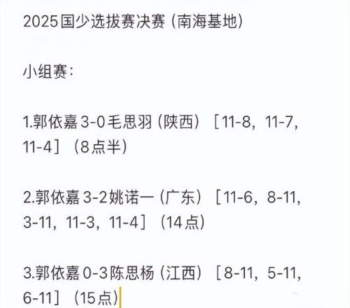 在2025乒乓球国少选拔赛中,奥运冠军王楠的女儿郭依嘉又一次在和陈思杨的交手中落败。郭依嘉3次碰上陈思杨都落败。陈思杨则连续3年入选国少集训队,并且在继2024年夺冠之后,再次杀进决赛,将冲击两连冠。